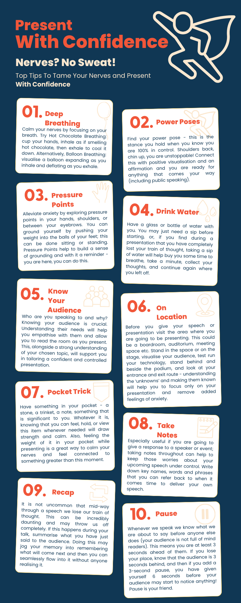 Public speaking doesn’t come naturally to everyone, and for many of us, nerves can feel overwhelming. The good news is that nerves are normal – and with the right strategies, you can channel them into confidence. Here are ten practical tips to help you calm your nerves, stay grounded, and deliver a presentation that leaves an impact.